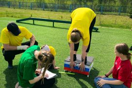 На старт вышли 17 команд по 4 человека – 2 мальчика и 2 девочки. За максимально быстрое время командам необходимо было пройти четыре станции, включающие прыжок в длину с места, метание теннисного мяча, бег 10 м и поднимание туловища из положения лёжа на спине.